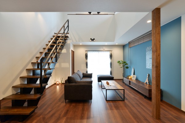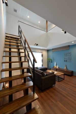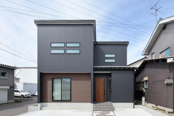 ■すっきりとした黒ガルバに木目サイディングと木目ドアがアクセント。