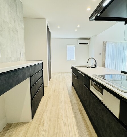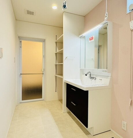 ダイニングキッチンから、洗面・サンルームや2階にもすぐ行ける動線の良さ
