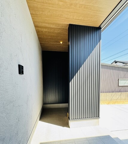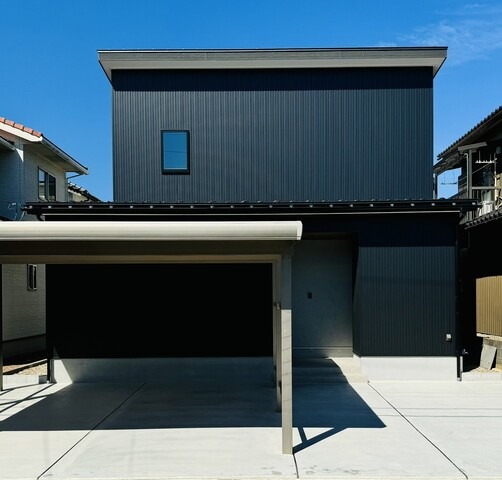 ガルバリウムとベルアート(塗り壁)の対比が映えるシャープな外観