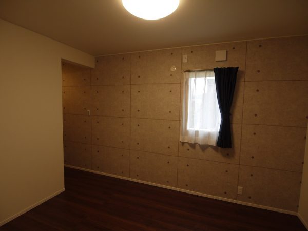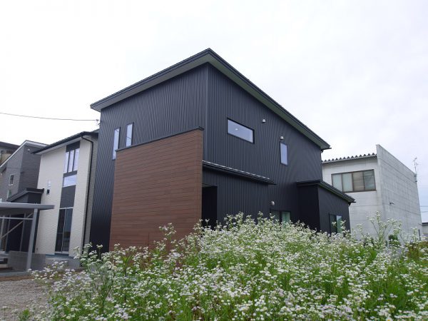 ■玄関目隠し壁の木目サイディングがポイント。ブラック基調のかっこいい外観