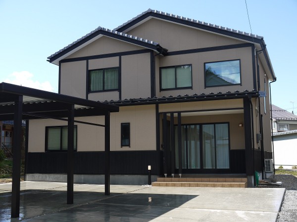 ■杉腰板と吹き付け、付け梁・柱など和風仕上げの外装。