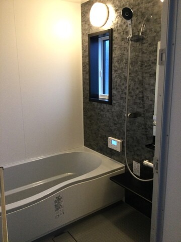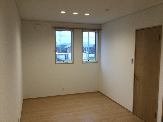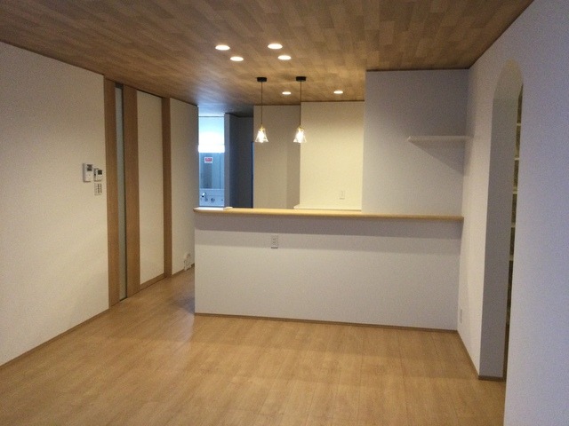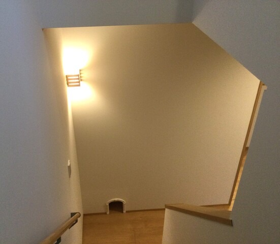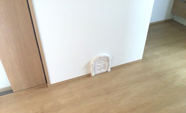 壁に取り付けた猫ちゃん用のペットドア(白い扉)がとても可愛いお家です。