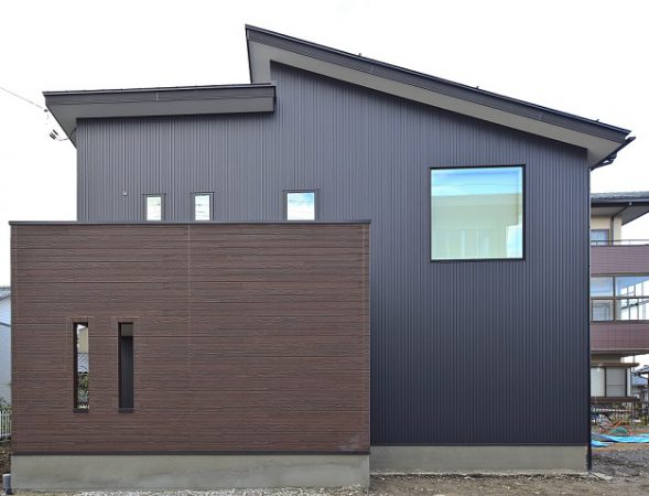■男前な黒のガルバに木目調サイディングがポイントの外観。