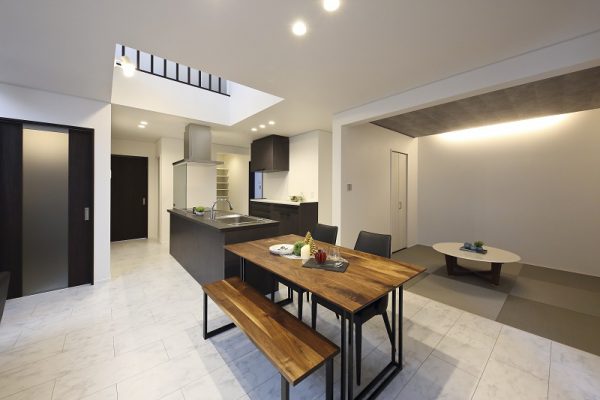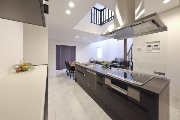 ■1F中央にあるセラミック天板のアイランドキッチンは重厚感たっぷり。