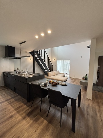 ストリップ階段とパネル手摺で抜け感のあるスタイリッシュなインテリア。